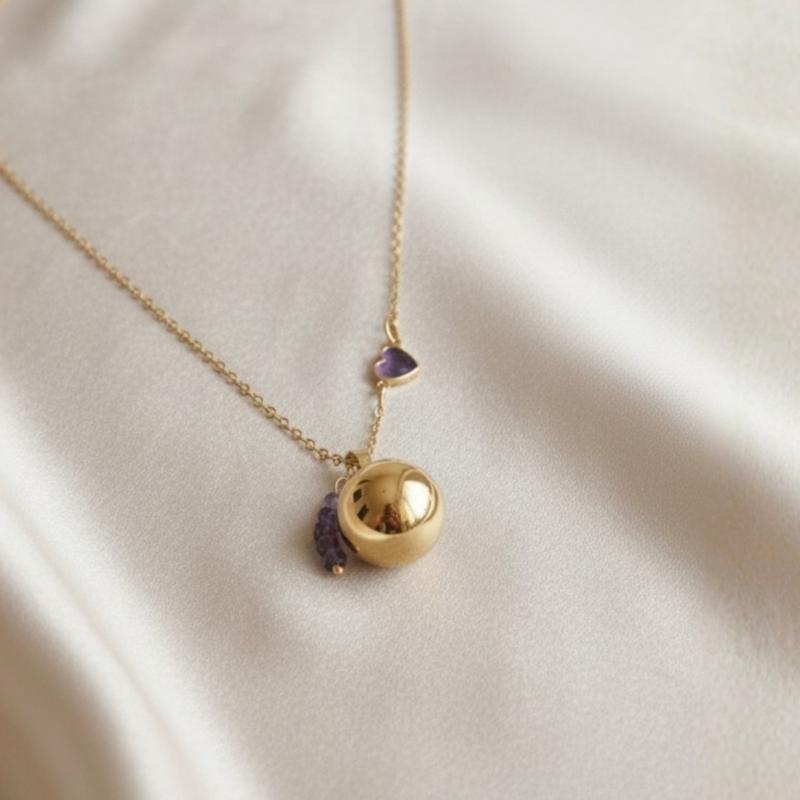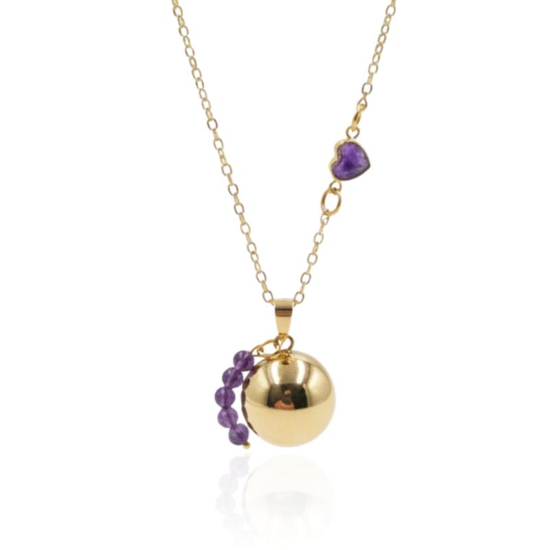 Habillez avec douceur votre ventre rond avec cette création originale Loupita : un Bola de Grossesse Doré avec 5 perles d'Améthyste, pierre naturelle. Le bola comporte également un coeur en améthyste intégré à la chaine.